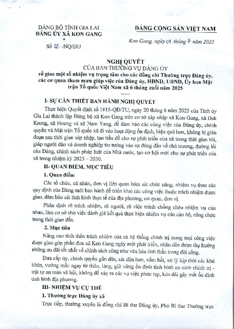 | Tiêu đề văn bản | NGHỊ QUYÉT CỦA BAN THƯỜNG VỤ ĐẢNG ỦY về giao một số nhiệm vụ trọng tâm cho các đồng chí Thường trực Đảng ủy, các cơ quan tham mưu giúp việc của Đảng ủy, HĐND, UBND, Ủy ban Mặt trận Tổ quốc Việt Nam xã 6 tháng cuối năm 2025 | ||