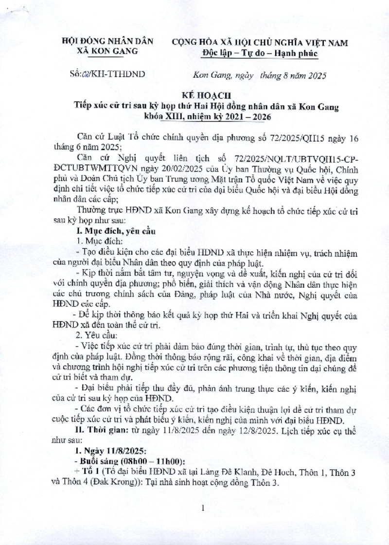 | Tiêu đề văn bản | KẾ HOẠCH Tiếp xúc cử tri sau kỳ họp thứ Hai Hội đồng nhân dân xã Kon Gang khóa XIII, nhiệm kỳ 2021 – 2026 | ||