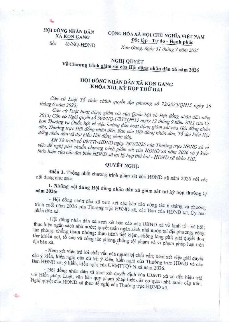 | Tiêu đề văn bản | NGHỊ QUYÉT Về Chương trình giám sát của Hội đồng nhân dân xã năm 2026 | ||