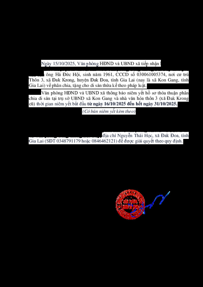 | Phạm vi | xã Kon Gang | Ngày ban hành | 16/10/2025 |