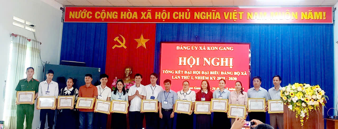 Để ghi nhận thành tích trong thực hiện những kết quả đạt được trong tổ chức Đại hội Đảng bộ xã Kon Gang lần thứ I nhiệm kỳ 2025-2030, Bí thư Đảng ủy, Chủ tịch HĐND xã Kon Gang đã quyết định khen thưởng cho 4 tập thể, 14 cá nhân có thành tích xuất sắc trong công tác tổ chức Đại hội đại biểu Đảng bộ xã lần thứ I, nhiệm kỳ 2025.