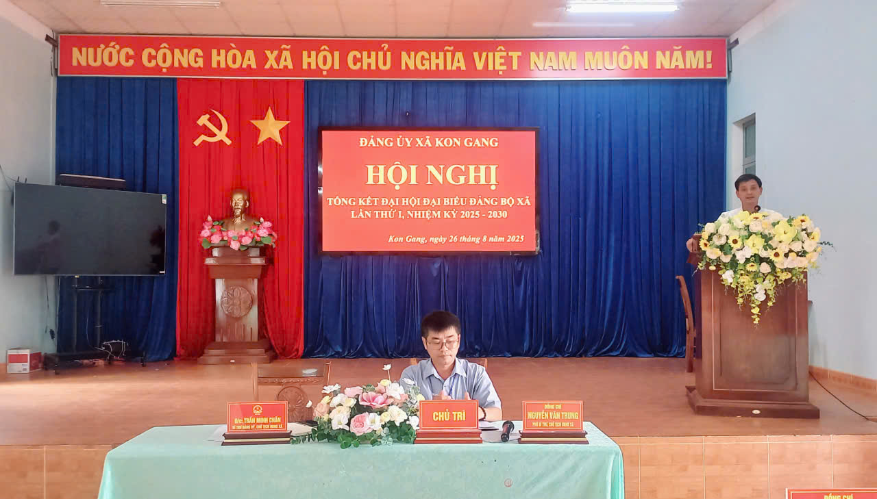 Trong thời gian hơn một tháng từ khi thành lập Đảng bộ xã Kon Gang đến nay, cùng với tập trung sắp xếp, kiện toàn, ổn định tổ chức bộ máy, phục vụ nhân dân sau sáp nhập, Đảng bộ xã Kon Gang đã lãnh đạo, chỉ đạo tổ chức thành công đại hội Đảng bộ xã lần thứ nhất, nhiệm kỳ 2025- 2030. Tất cả mọi công tác chuẩn bị nội dung, điều kiện để tổ chức Đại hội được triển khai với tinh thần nghiêm túc, trách nhiệm chính trị cao. Việc tổ chức Đại hội được triển khai nghiêm túc theo Chỉ thị 45-CT/TW của Bộ Chính trị “về đại hội đảng bộ các cấp tiến tới Đại hội đại biểu toàn quốc lần thứ 14 của Đảng” và các văn bản lãnh đạo, chỉ đạo của Trung ương, của tỉnh có liên quan, đảm bảo yêu cầu về tiến độ, nội dung và chất lượng.